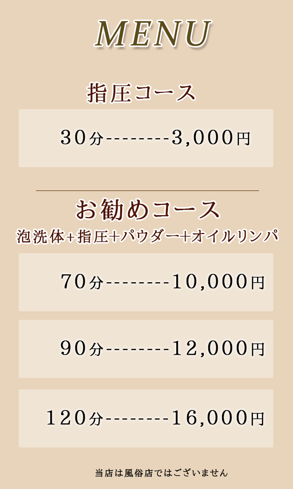 当店はアロマオイルを主体にしたリラクゼーションサロンでございます。日々の肉体的な疲れを全身指圧マッサージとアロマオイルマッサージを用いて、筋肉の疲労をケアし、疲れを少しでもご解消いただけますよう精一杯マッサージさせて頂きます。